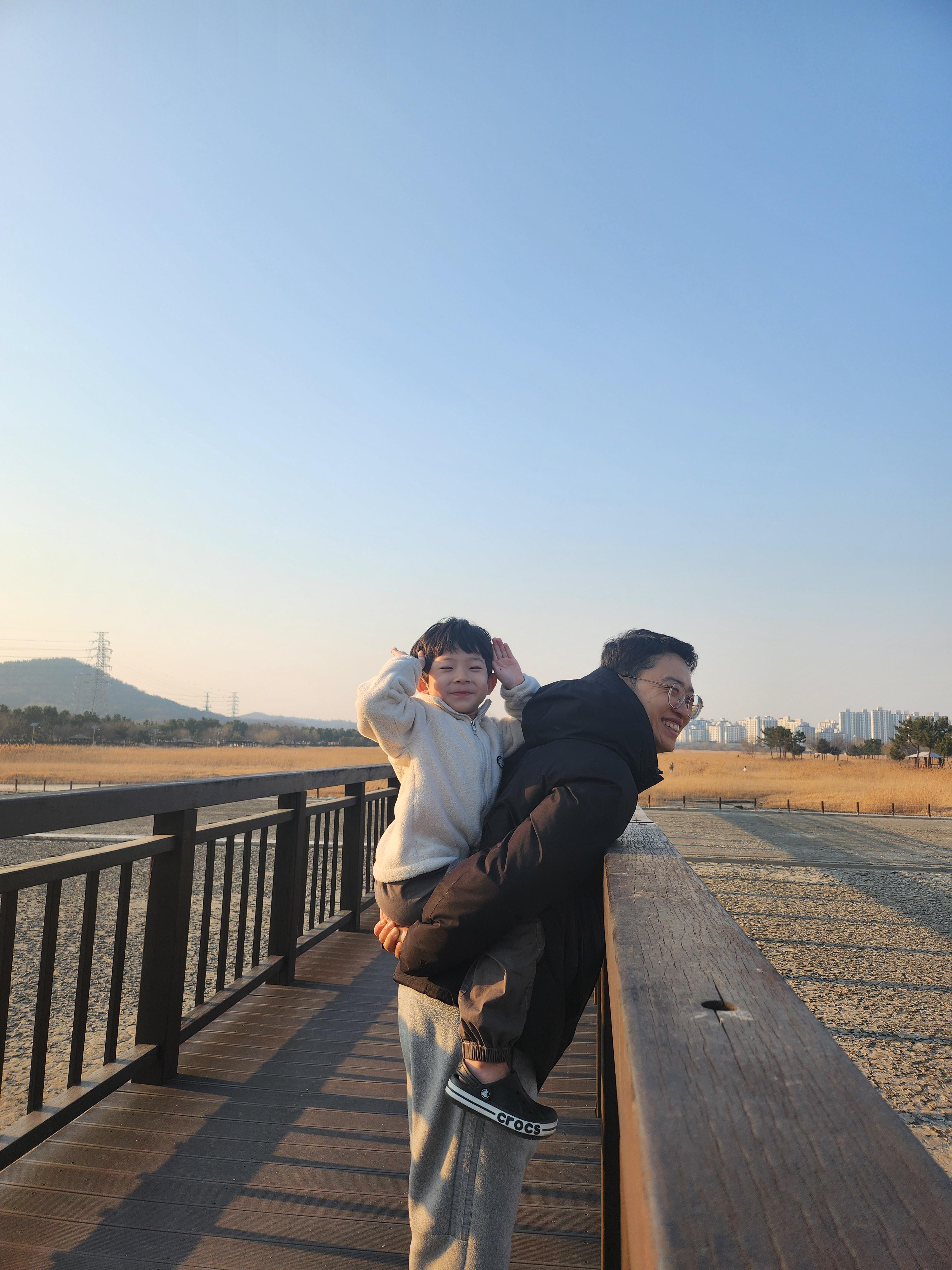 아직 조금 쌀쌀한 날씨였는데도 하늘이 워낙 맑고 화창해서 기분 좋게 나왔습니다. 봄이 오기 직전의 그 특유의 청명함 공기가 차갑지만 맑아서 사진이 잘 나오는 그 타이밍이요. 아이 손 잡고 산책로에 들어서자마자 확 트인 갈대밭이 눈에 들어왔는데, 도심에서 이런 풍경을 만난다는 게 여전히 신기했습니다.